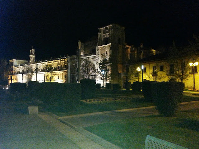 Which we also went to from there, being at the further out reaches of town (in the opposite direction of our home) to Plasa San Marcus, what an incredibly enormous building this is, apparently it was an original dwelling for peregrinos de camino de Santiago!!! Surely a most humble and generous purpose for a such a building that can easily be mistaken for a castle or even a palace. I found it slightly amusing but more incredulous that it is now a very ritzy Hotel! And likely not a single pilgrim would be able to afford to step inside just to shelter from the rain let alone sleep the night. Fredy took a couple of photos of me sitting beside the bronze pilgrim who has taken his sandals off for a breather (I did the same just after the photo was taken, the new shoes keep my feet warm but they're still giving me blisters).